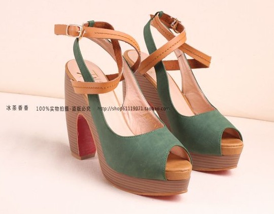 任意搭交叉绑带搭扣纯色 美腿鱼口高跟粗跟凉鞋