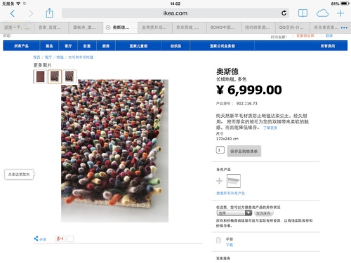 这块宜家纯羊毛质地地毯是2012年初在北京宜家购买,尺寸为170*240cm。但搬新居后,发现客厅的布置和装饰不适合铺地毯,因此一直未拆封闲置至今。浏览过宜家地毯的朋友应该对此款会有印象,应该是当年宜家出售的质量最好,最畅销的地毯。如想进一步了解的朋友,请留言与我联系。 图片: