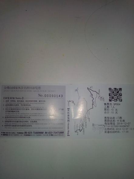 重庆金佛山门票10兑换券(就是说在景点大门购票处用此券再加10块钱就可以换到原价75元的门票了,有效期为2014年12月31日)。
