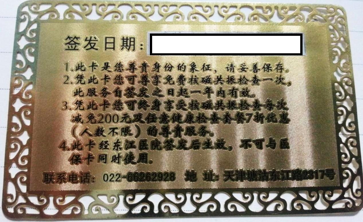 医院体检优惠金卡,凭此卡可享受1次免费核磁共振检查,发放之日一年内有效。凭此卡可享受核磁每次减免200元及体检套餐7折(人数不限)的优惠活动。此卡不能同医保卡同时使用。
