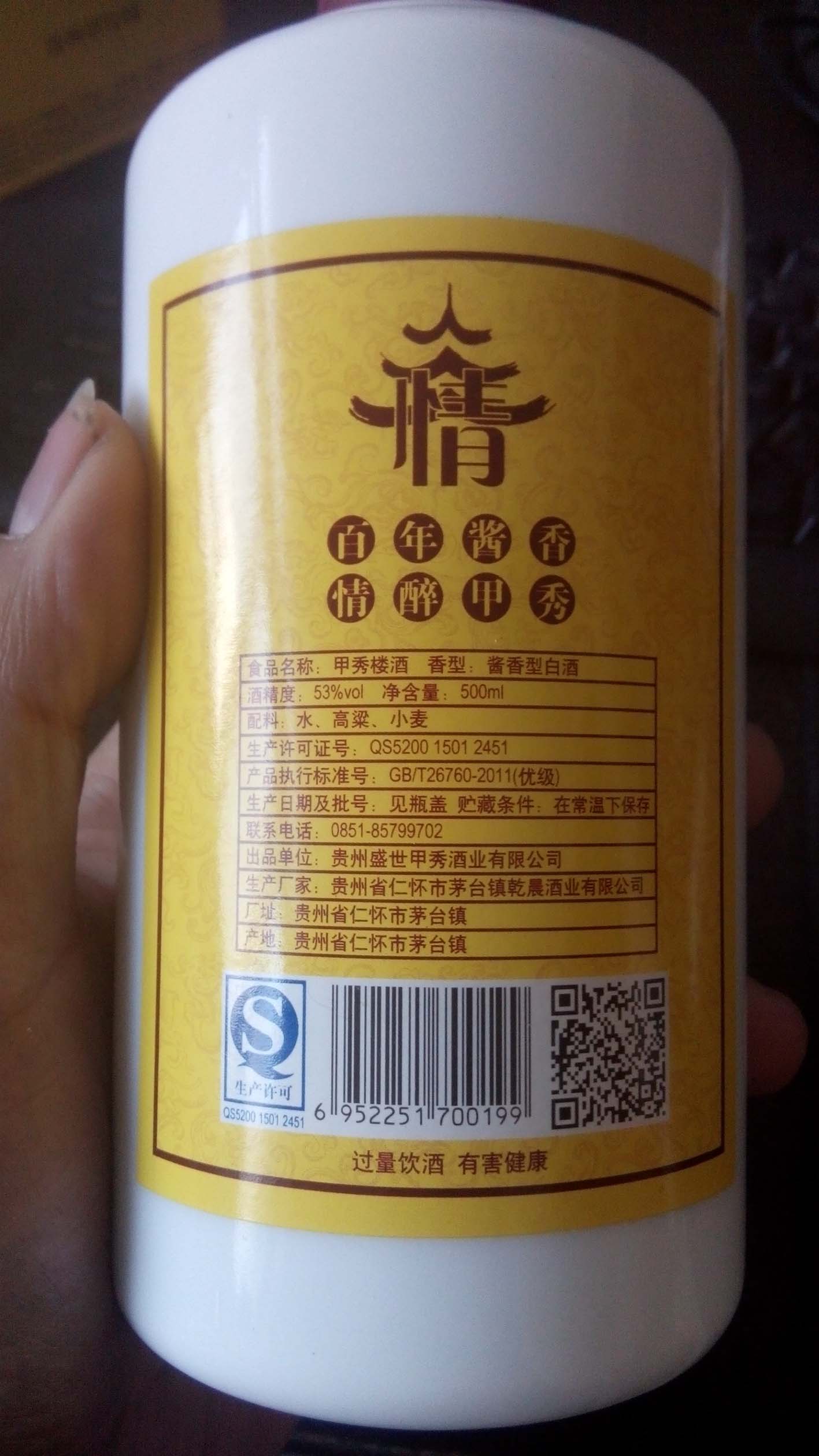 甲秀楼酒产于中国贵州茅台镇,以本地优质高粱、小麦、水、为原料,利用得天独厚的自然环境,采用独特的传统工艺精心酿造而成。具有酱香突出、优雅细腻、醇厚丰满、香味舒适显著、回味悠长、空杯留香持久的特点。