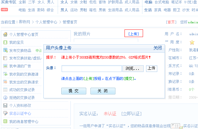 点击上传弹出头像上传对话框,点浏览选择您的头像,选择好后点后面的上传按钮,然后点击提交,头像提交成功