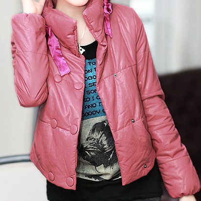 韩版冬装女式新款领口抽带短款PU皮棉衣棉服