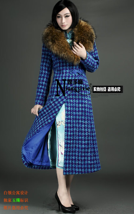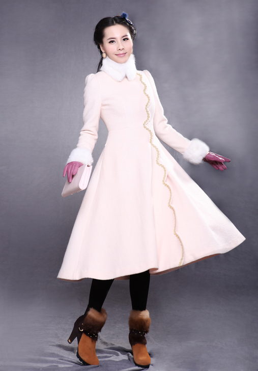 尤麦秋冬长款修身钉珠带毛领毛呢大衣冬季外套