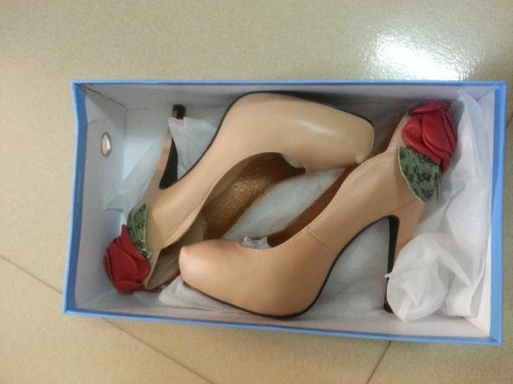 实拍安玛莉真皮防水台花朵叶子单鞋 杨颖同款 杏色低价转