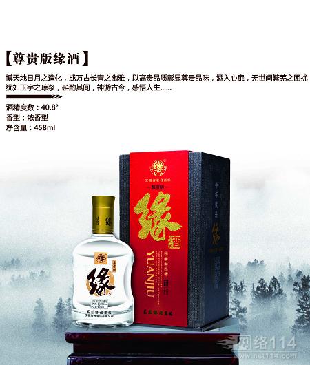 “缘”酒传达一种珍惜缘、重视缘,平和、豁达的人生态度; “缘”酒是一种把握缘、创造缘,主动争取,积极向上的事业态度; “缘”酒传达共生,合作,宽容,感恩的理念,让人们在饮酒的同时,也更能增进情感,促进交流,让事业一帆风顺,让人生处处平安,让社会美满和谐。