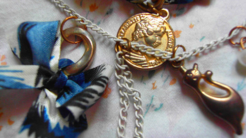 女孩们的闲置的物总是一堆一堆又一堆...有的是礼物有的是自己买的,蓝色和黑色的比较旧,好在就是复古风。不过蓝色的双层手链略肥哦~再除去双层毛衣链均为全新。那个毛衣链超bling的,里面的大颗钻石是活动的,轻质不锈。喜欢的快联系我,想买的自己出价就好,易物的感觉行就OK.