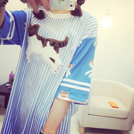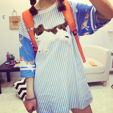 原宿 超萌 刺绣猫猫竖条纹BF