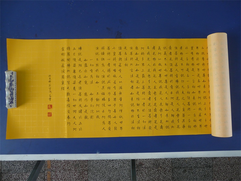黄色洒金宣纸书写,纸有接,有格2x2cm