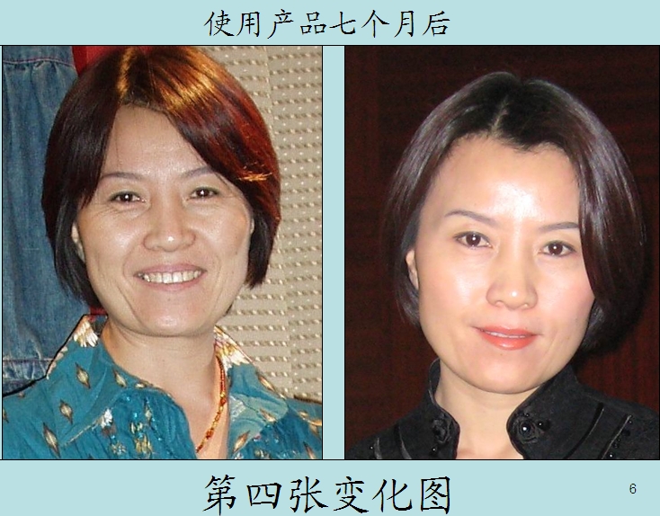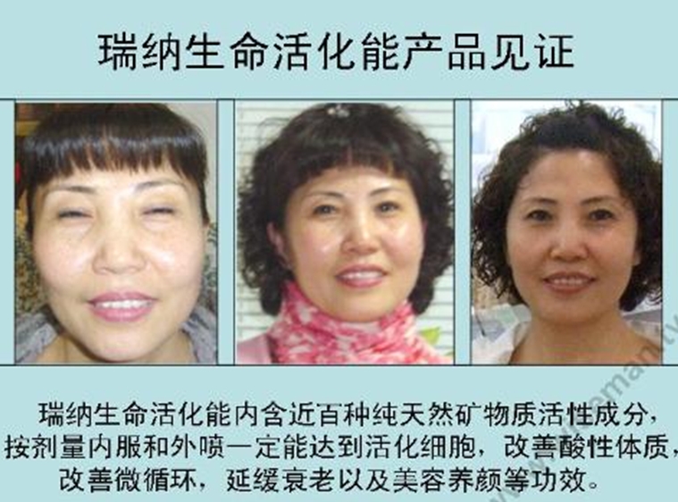 产品试验(撕开市场利器) 1.半边脸示范。先照镜子及请别人互相观察使用前的样子,皱纹、眼袋、色泽脸部提升等状况,然后将产品喷于半边脸,反复三次(每次自然干后,再喷一次),再左右脸对比;另外再做手的试验,喷一只手,反复三次后,左右手对比。结果发现脸部皮肤白润、皱纹明显被打开;20分钟即可见效!手部也有明显差别(因人而异相差3-5年粗嫩程度) 2.颈椎疼痛示范。喷于颈椎疼痛或腰腿关节疼痛处,发热止痛. 3.茶叶示范。两杯透明杯各放同等茶叶和凉水,其中一杯滴入内服产品几滴,见到此杯中茶叶成分全然被浸出,证明瑞纳也太远红外极具穿透力,减小水分子,迅速摄取,易于人体吸收. 4.PH试纸示范。调节酸性体质,号称碱性产品之王 5.碘酒示范。铁氧化生锈,人氧化生斑,瑞纳具有超强抗氧化能力 6.色拉油乳化示范。分解油脂,排出细胞毒素,改善细胞内环境。