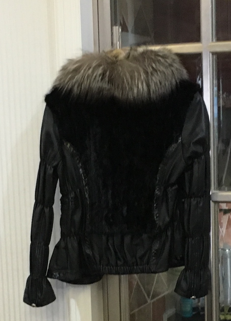 狐狸毛领,前襟和后背是拼接貂毛皮草保暖不臃肿,衣服是羊皮的,非常柔软,皮衣配饰也是牛漆皮的,整体修身时尚,可以配裤子、裙子。M码,适合体重不超过110斤的女性穿。